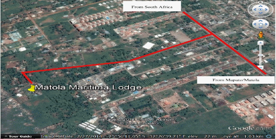 Drive straight into Matola Maritima Lodge( Red steel gates) GPS Location : S 25 deg 56’ 15,0” E 032 deg 26’ 23,2”